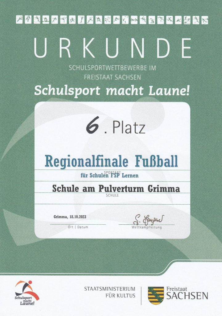 Am 18. Oktober 2023 nahm unsere Fußballmannschaft am Regionalfinale im Husarensportpark in Grimma teil. In einem hochkarätigen Turnier traten sieben Teams gegeneinander an. Der Modus des Turniers sah vor, dass jede Mannschaft gegen jede andere spielte. Die Spielzeit betrug jeweils zehn Minuten.